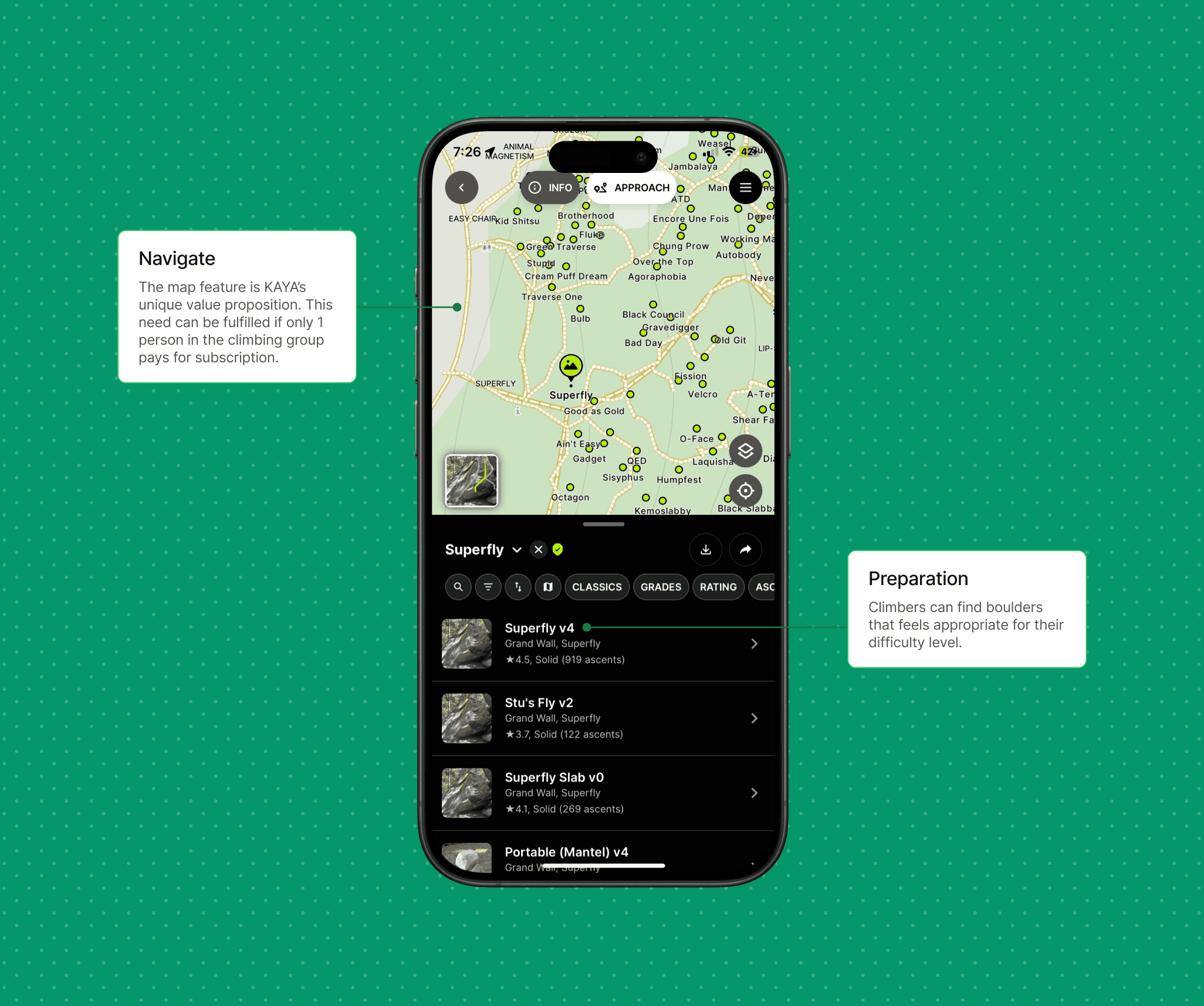KAYA is a bouldering app that helps climbers discover and navigate to outdoor boulders and indoor gym climbs.