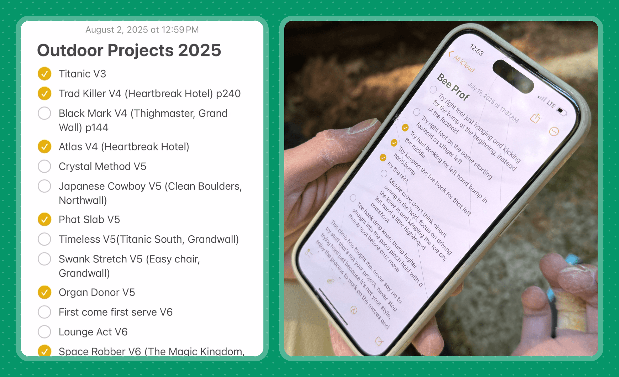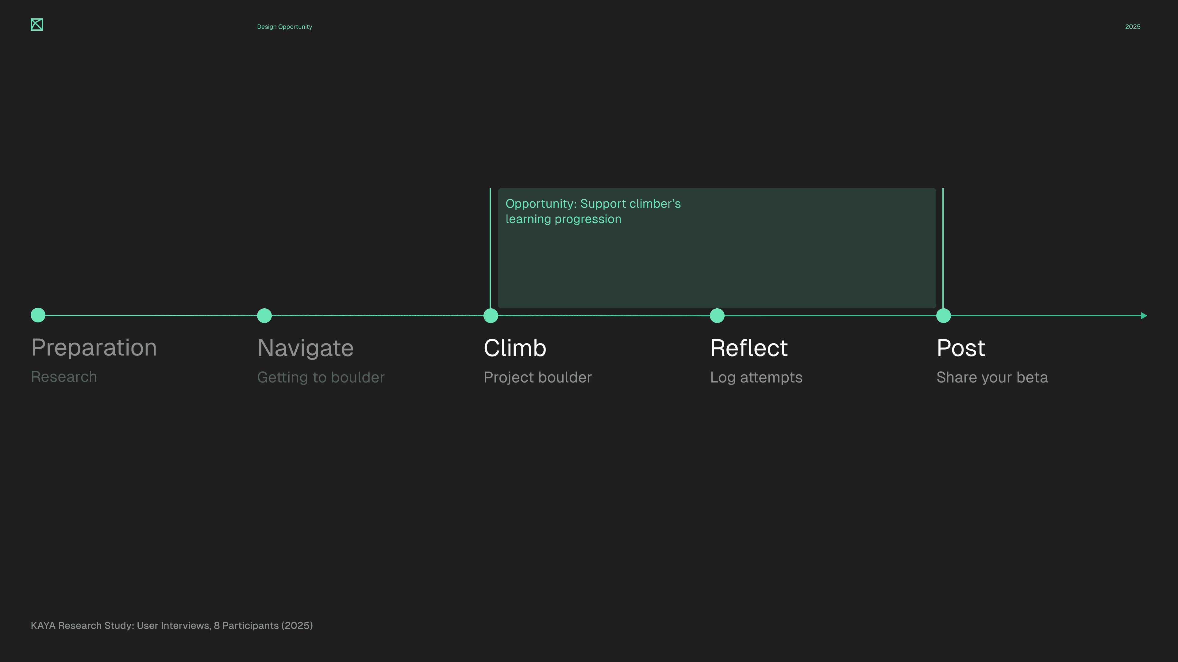 Research revealed unmet needs for qualitative progress tracking, with climbers relying on notes apps, personal videos, or Instagram to reflect on their progress.