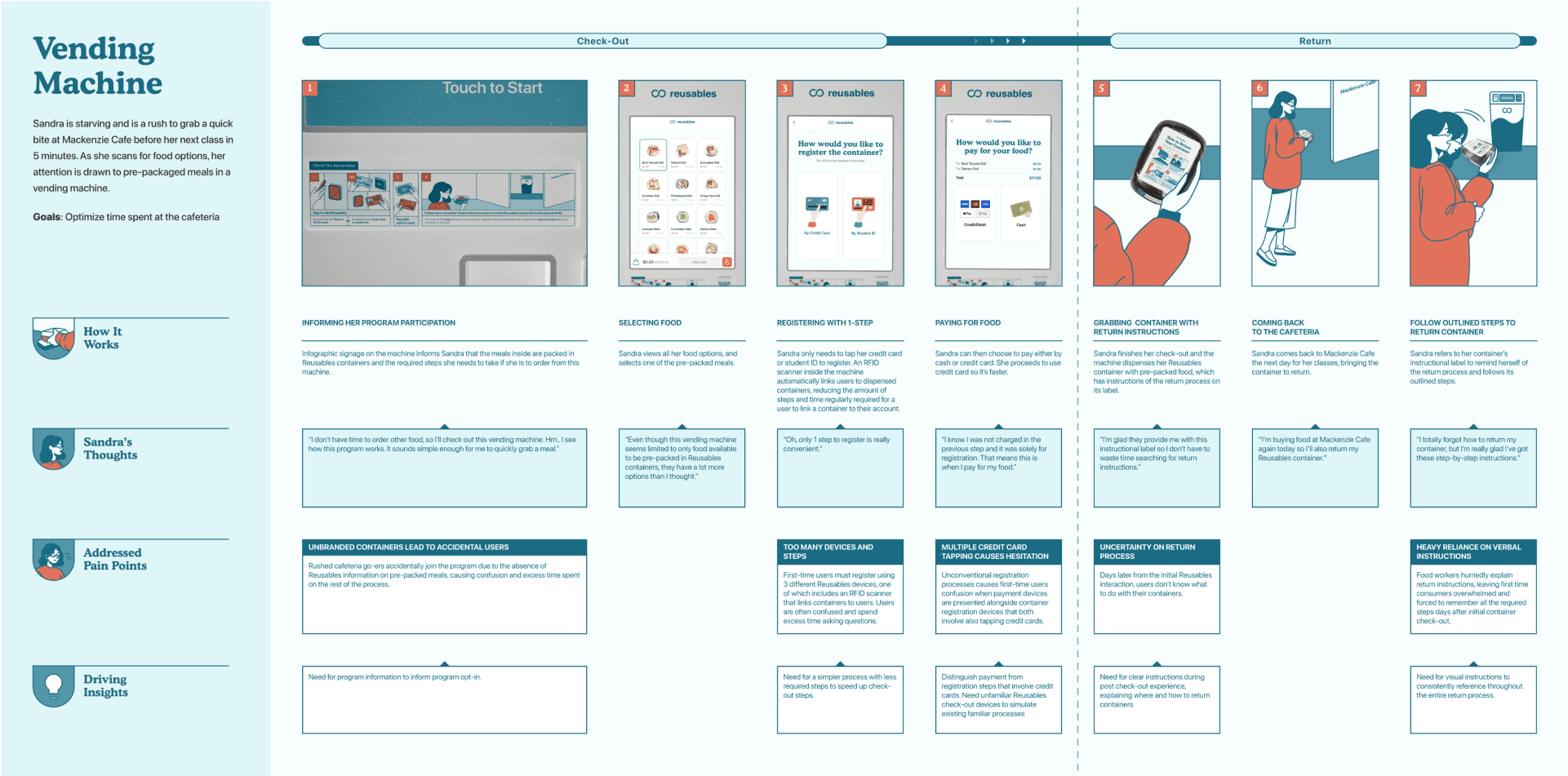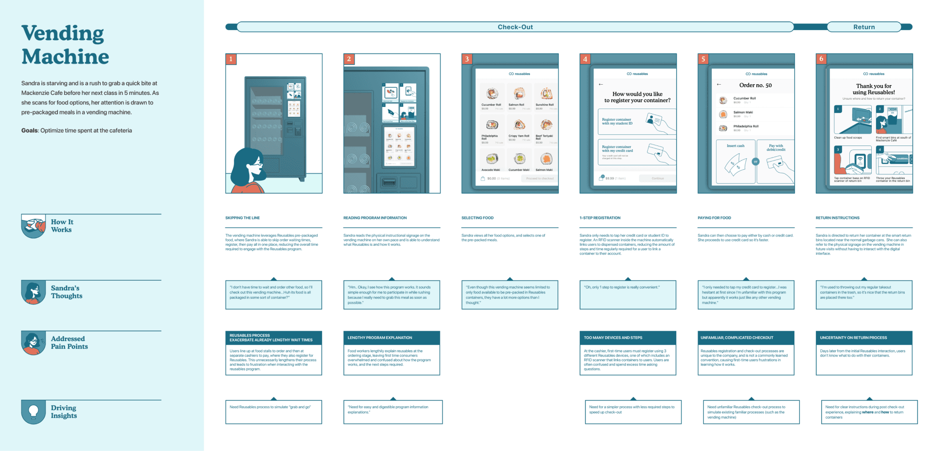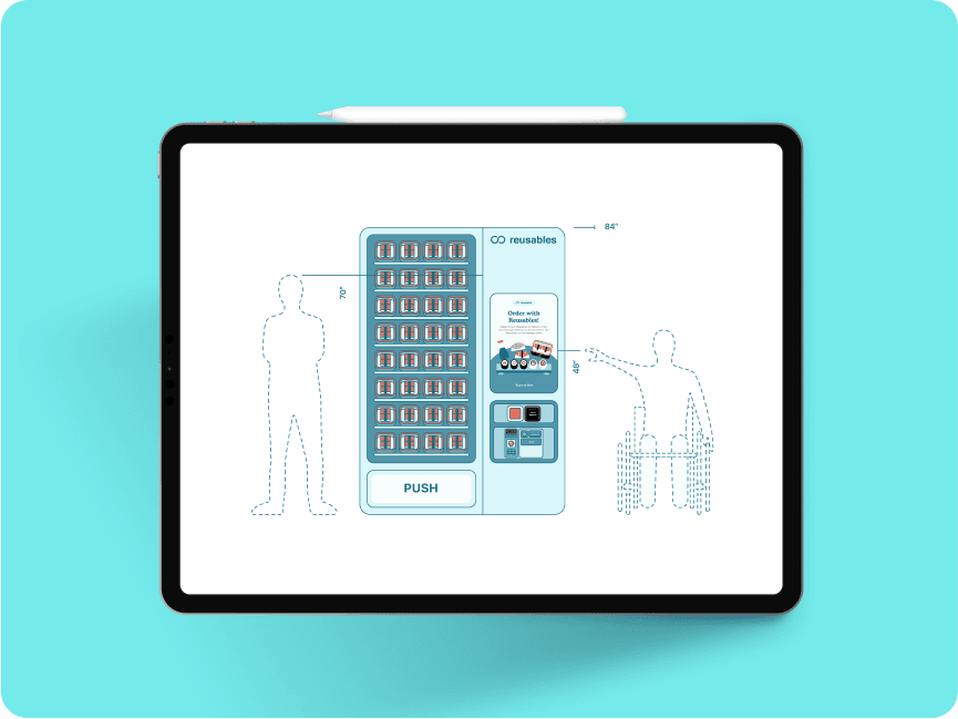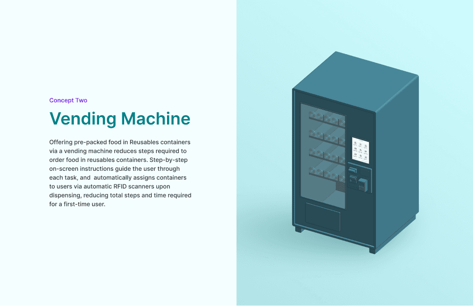 Reusables is a sustainable packaging initiative that offers reusable containers to reduce single-use waste in campus cafeterias. However, the program requires extra steps which leads many first-time users to perceive it as inconvenient. To address this, we designed a Smart Vending Machine that dispenses food in Reusables containers and guides first-time users through the registration and return process.