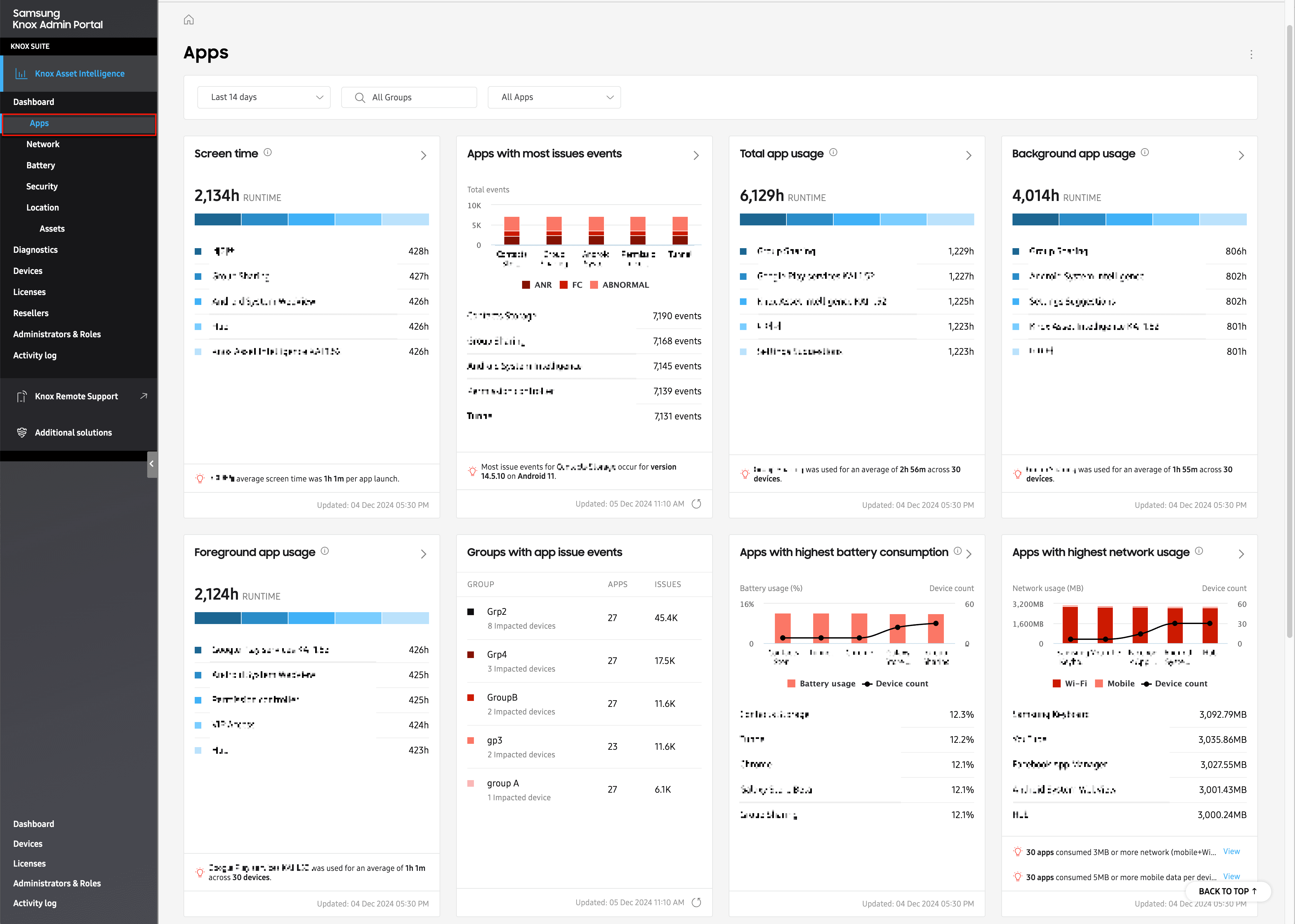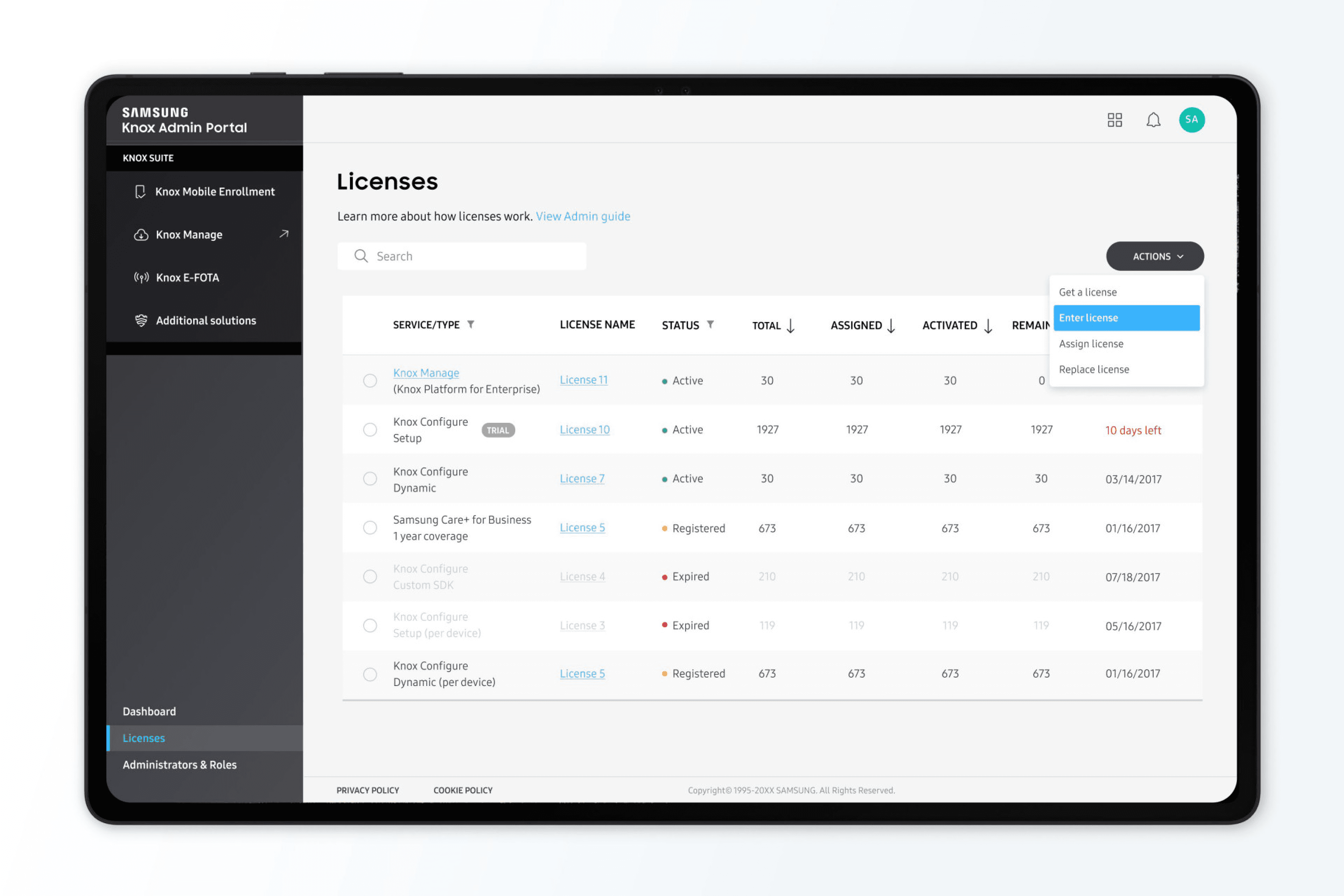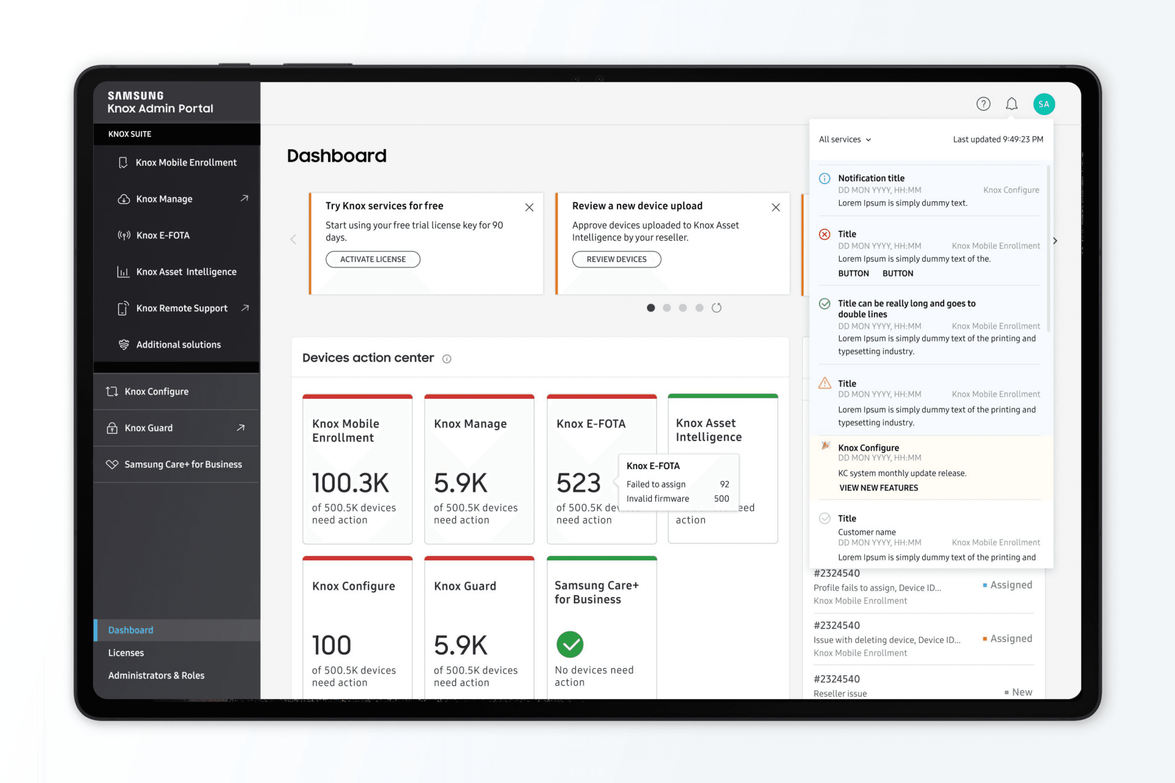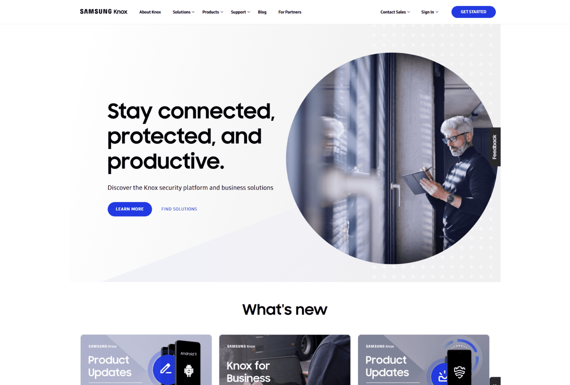 Samsung Knox provides enterprise-grade solutions for enterprises to support IT admins in device management, troubleshooting, and asset intelligence. Some of our products include: